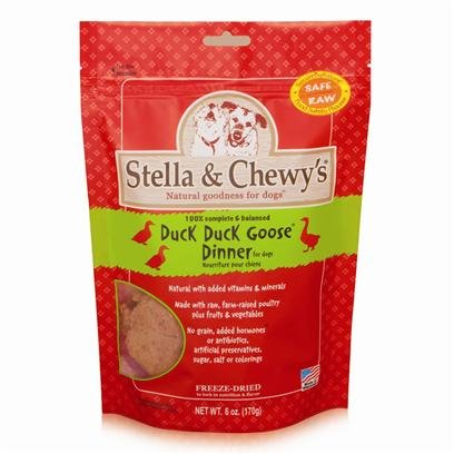 Raw for dogs who won't eat frozen raw, August 4, 2010 By This review is from: Stella & Chewy's Freeze-Dried Raw Duck Dinner for Dogs, 16oz (Misc.) My German Sheperd will not eat the frozen raw patties no matter what brand I try, but he eats all the Stella and Chewy's freeze dried with no hesitation. I buy in bulk to save money and give him 6-9 freeze dried patties per day. It has really helped his ear problems since I've incorporated this into his diet. He no longer needs ear meds or cleaners and he has been staying symptom free. I have tried so many different frozen paties -- different brands different proteins. He had no interest in the frozen stuff no matter what tricks I tried, but there has never been a problem with getting him to eat the Stella and Chewy's freeze dried. He especially likes the Duck Duck Goose. My cats like it too. (I emailed the company. All of their products are for both dogs and cats.)