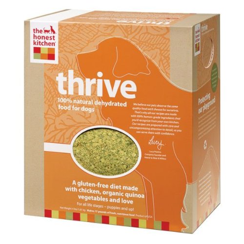 Food even the pickiest dog would eat, July 11, 2012 By Amazon Verified Purchase This review is from: Honest Kitchen Thrive, Gluten-Free Dehydrated Raw Dog Food w/ Chicken, 4lb (Misc.) In the last couple of months, my 4.5 year old Maltichon decided to be extremely particular about the food he ate. I went through several high grade kibble and wet food (Natural Balance/Acana/California Natural) but he refused to eat it. Ultimately, he went on a food strike and started to lose weight. I went back to researching food and found this on Amazon. I figured I had nothing to lose, my dog wasn't eating much already. When I introduced the Honest Kitchen, he sniffed, licked and then proceeded to inhale like he hadn't eaten in weeks (which he hadn't).